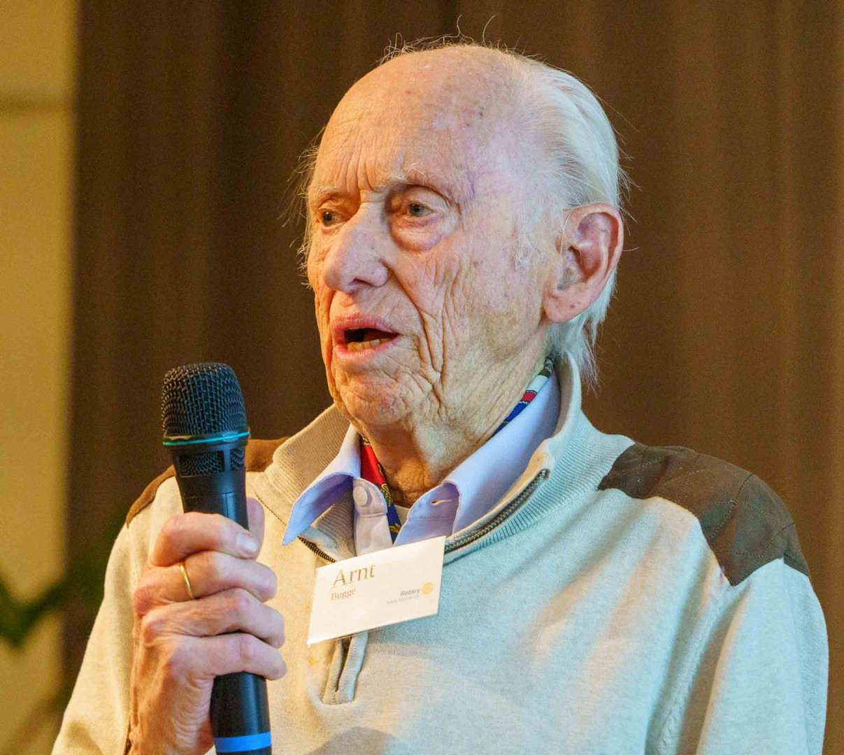 Kveldens treminutter var ved Arnt Bugge. Trumps politikk i USA nå hadde minnet han om forløpet til annen verdenskrig, som han fortalte om sin personlige erfaring med. Arnt er født og oppvokst i Mandal, der tyskerne forskanset seg med 10.000 mann under krigen. Midt i byen ligger høyden Uranienborg (eller Torjusheia), som tyskerne satte tre store kanoner på og gjennomhullet med bunkere og tunneler. Rundt Uranienborg lå det jorder der skilt advarte om minelegging. Fordi det likevel gikk kuer og gresset der gikk Arnt og to kamerater en dag i juni 1944 ut på området. For sent oppdaget de utløsertråder på bakken, og to-tre miner gikk av samtidig. Arnts to kamerater ble drept og han selv ble så sterkt skadet at han måtte inn og ut av sykehus i et halvt år før han kom seg så noenlunde.