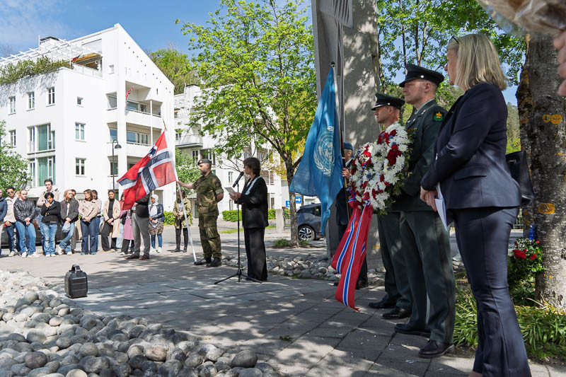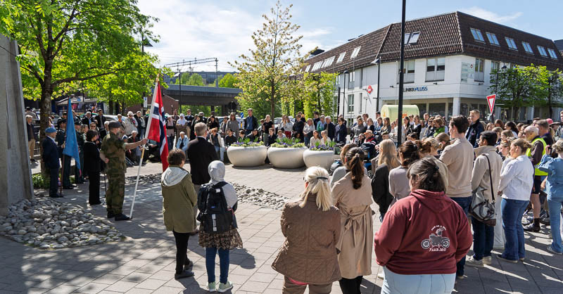 Ordfører Lisbet Hammer Krog minnet i Sandvika om at bæringen Tronstad ofret alt i kampen for Norge. Leif Tronstad, som vokste opp i Sandvika, planla aksjonen mot tungtvannsfabrikken på Rjukan under krigen. Han falt i kamp med norske angivere på Hardangervidda bare to måneder før krigen var slutt, 41 år gammel. I alt døde over 10 000 norske borgere som følge av krigshandlinger. Henvendt til de mange frammøtte avgangselevene fra Sandvika videregående skole understreket ordføreren at det er en grunnlovsfestet plikt å forsvare landet. “Frihet og demokrati må vinnes hver dag”, slo hun fast.