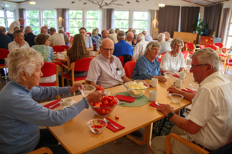 Hyggelig samvær med ferske jordbær og iskrem på Rykkinn Seniorsenter.