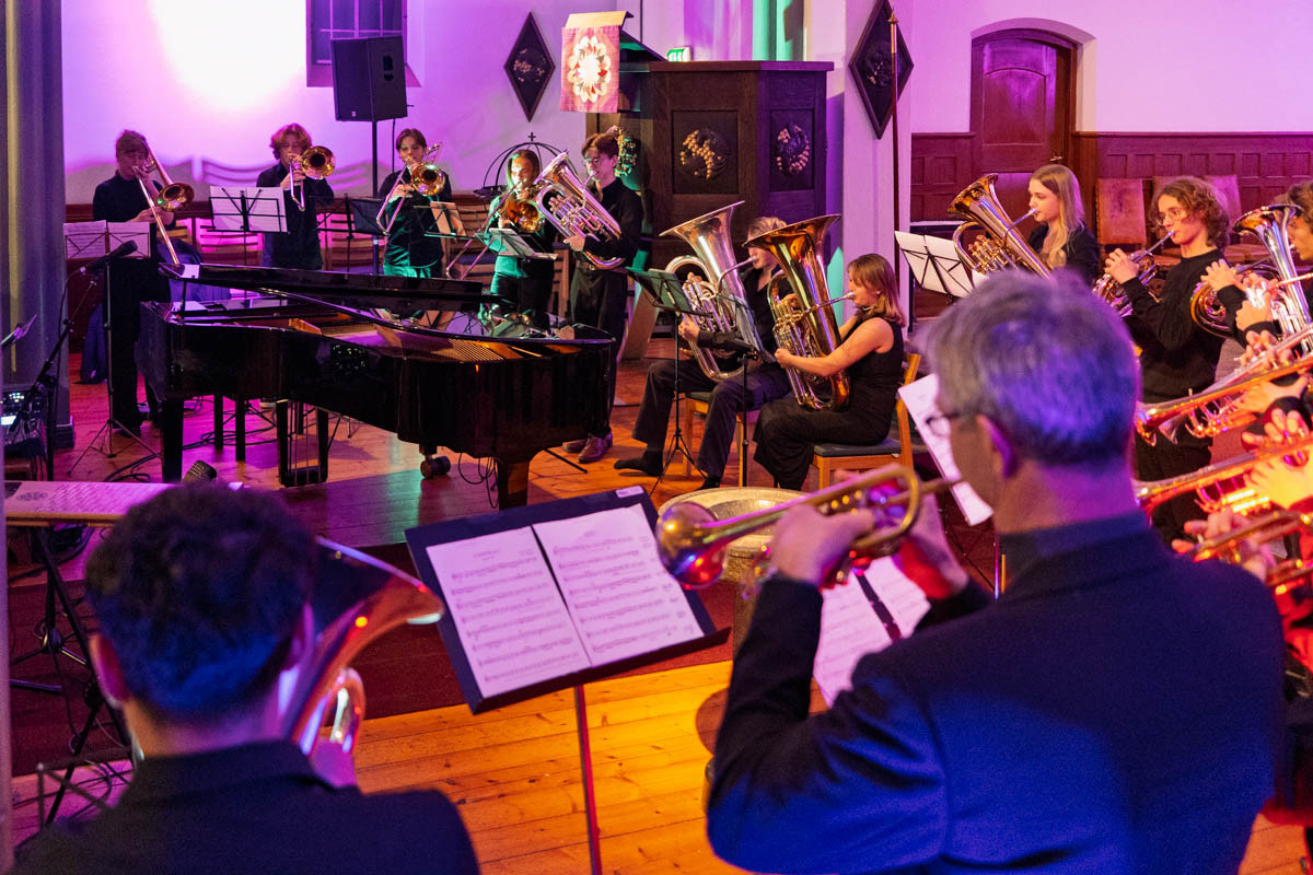Elevene fra Rud videregående skoles linje for musikk, dans og drama satte sitt tydelige preg på konserten. Stian Carlo Layda frambrakte fløyelsmyke toner på eufonuim i Ricardo Mollás Belén, og både samspillkoret og messingblåser-ensemblet imponerte. Messingblåserne framførte blant annet Rondeau av Henry Purcell med fullt trøkk og presisjon.