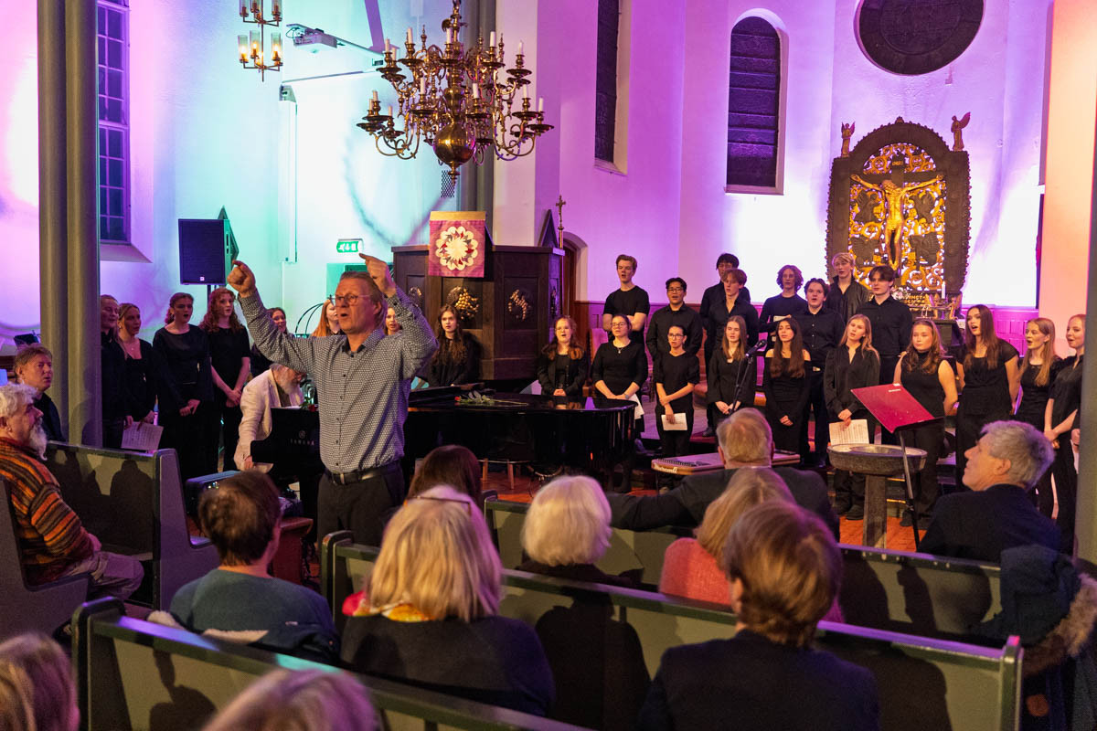 Øystein Fevang, konsertens musikalske organisator, fikk publikum med på allsang som avslutning av konserten.